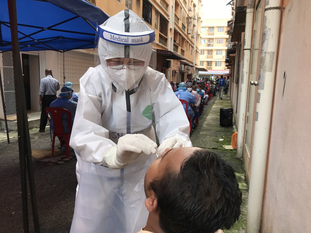 A health worker swabs a patient for RT-PCR test in Klinik QFFD in Ampang, as part of the COVID-19 response. Photo: MERCY Malaysia