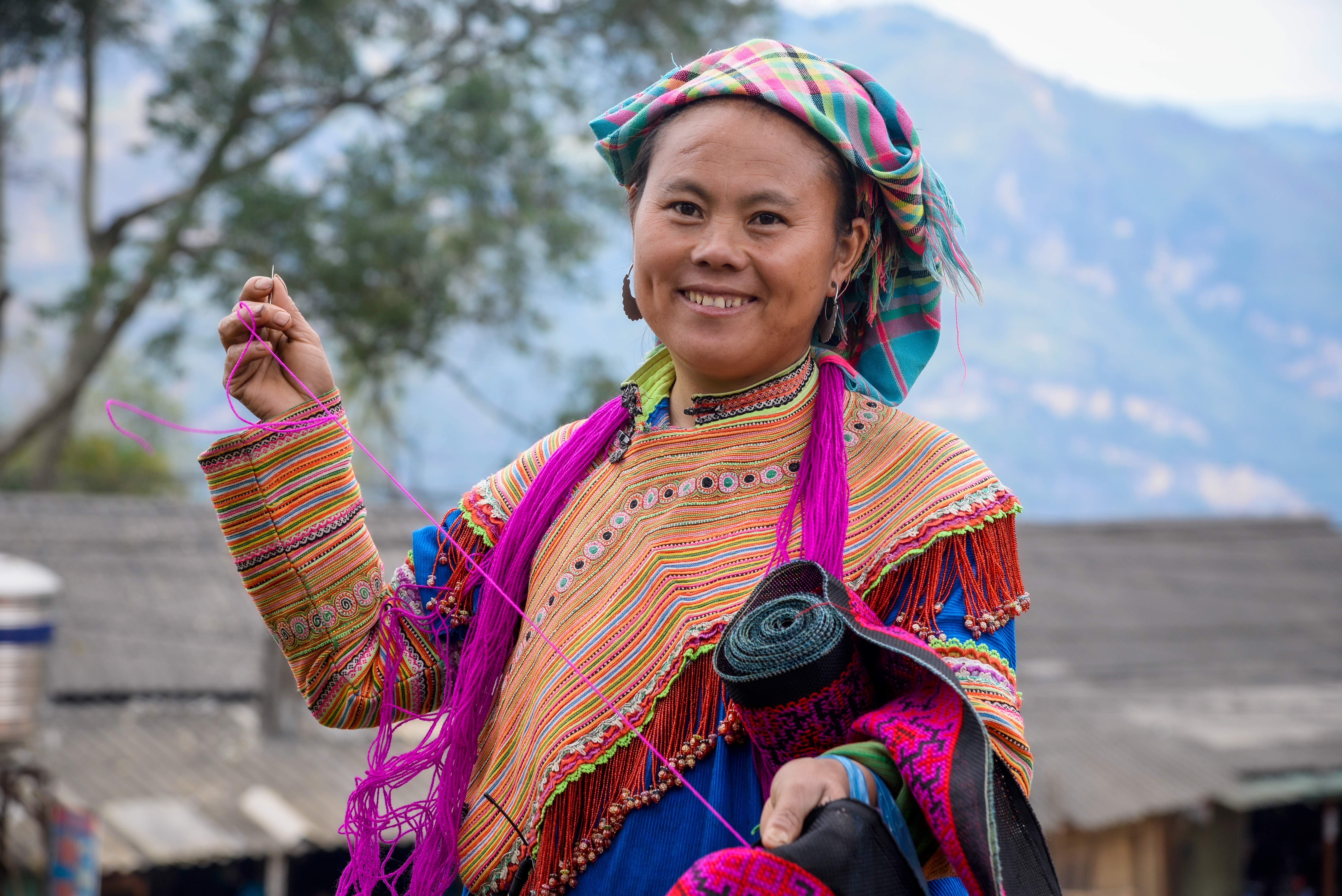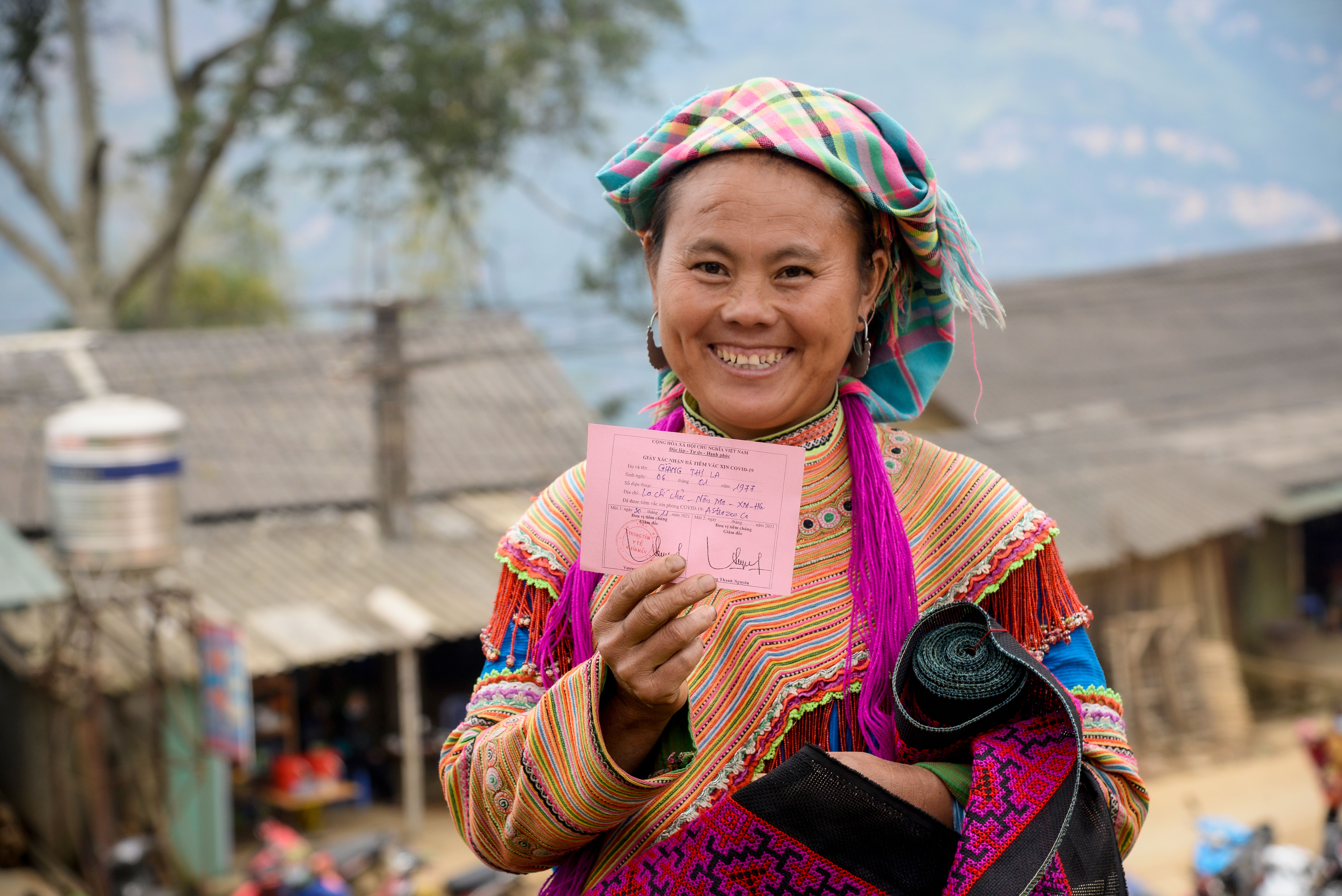 While waiting for her second dose of COVID-19 vaccine at Xin Man commune health station in Ha Giang, Mrs La worked on embroidery to sell at a monthly market along with her farm produce.