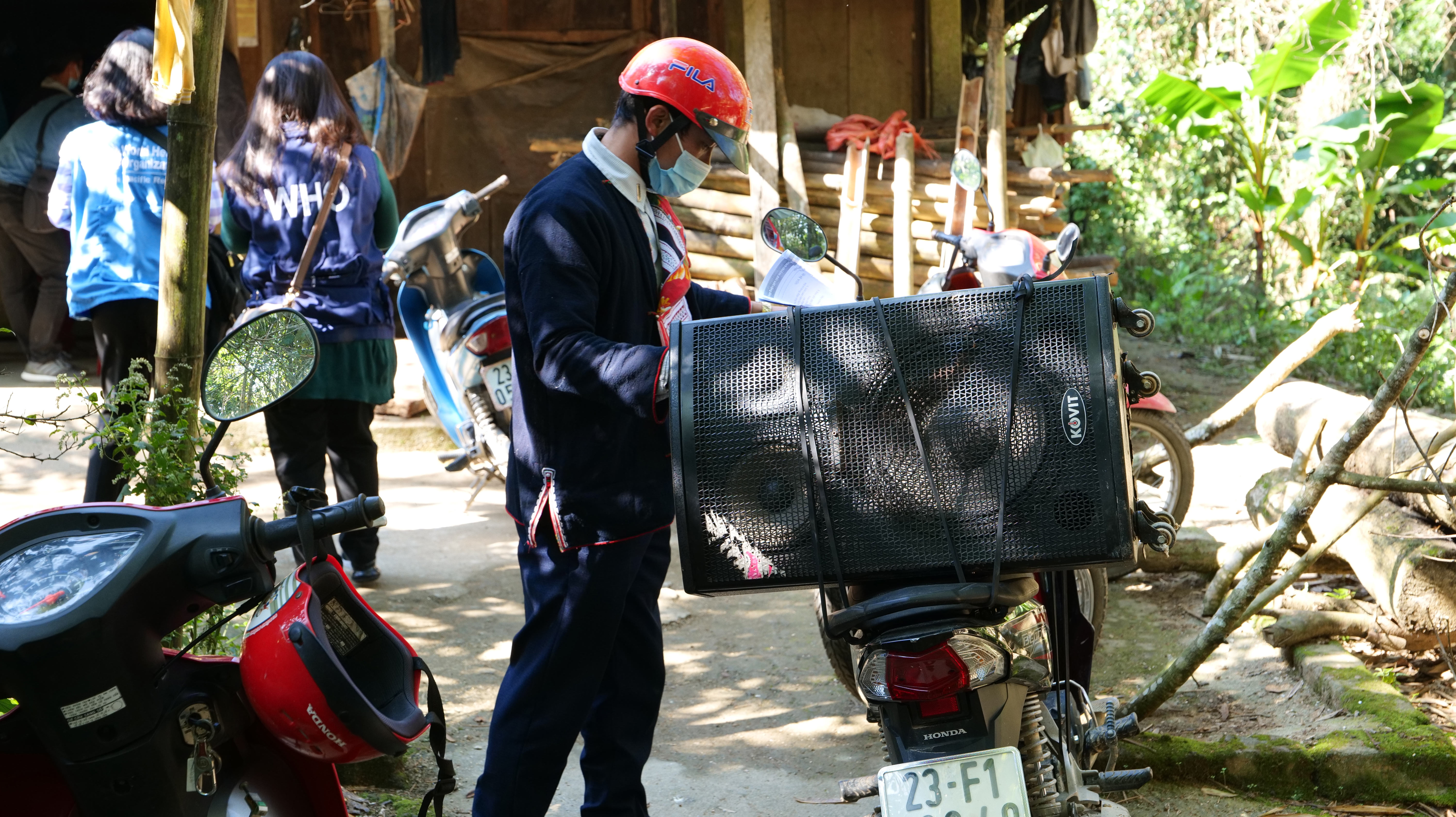 So, Mr Pao drives around on his motorbike, a giant loudspeaker strapped to the back broadcasting recorded messages about vaccination and COVID-19 measures in Vietnamese and the local Dao language. He also drives house to house, and talks to people about COVID-19.